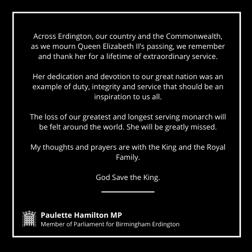 “Across Erdington, our country and the Commonwealth, as we mourn Queen Elizabeth II’s passing, we remember and thank her for a lifetime of extraordinary service.